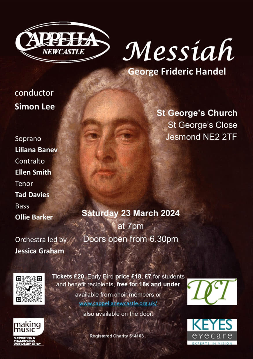 Simon Lee writes: We are delighted that you have joined us for this evening for our performance of Handel’s oratorio, Messiah. This is Cappella Newcastle’s largest scale concert since the pandemic, and we are delighted to be joined by four fantastic young soloists plus an orchestra for this core work of the choral canon. If this is your first time at a Cappella concert, may we offer you a particular welcome – we hope that this will be the first of many times that you join us. If you are a regular member of our audience, welcome back! Here in the sumptuous acoustic of St. George’s Church, Jesmond this monumental work will unfold from the opening Sinfonia, to ‘Comfort Ye’, through the Christmas story and into the Passion narrative. Our soloists, all at the start of their professional singing careers promise to delight and enthral. Handel was a prolific composer, writing 42 operas, 25 oratorios and more than 120 smaller works including cantatas and trio sonatas plus a large number of organ concerti. He is still extremely popular today; his anthem Zadok the Priest, written for the coronation of George II, has been performed at every coronation since. His style is engaging for both listener and performer alike. Programme available for download here